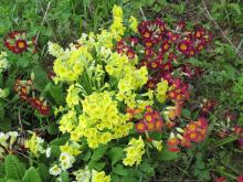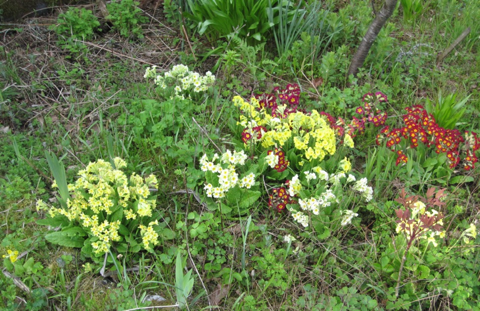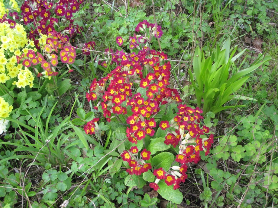 Once I planted 3 different Primula cv here, one white, one red and one yellow. Now they have done some crosses of their own.