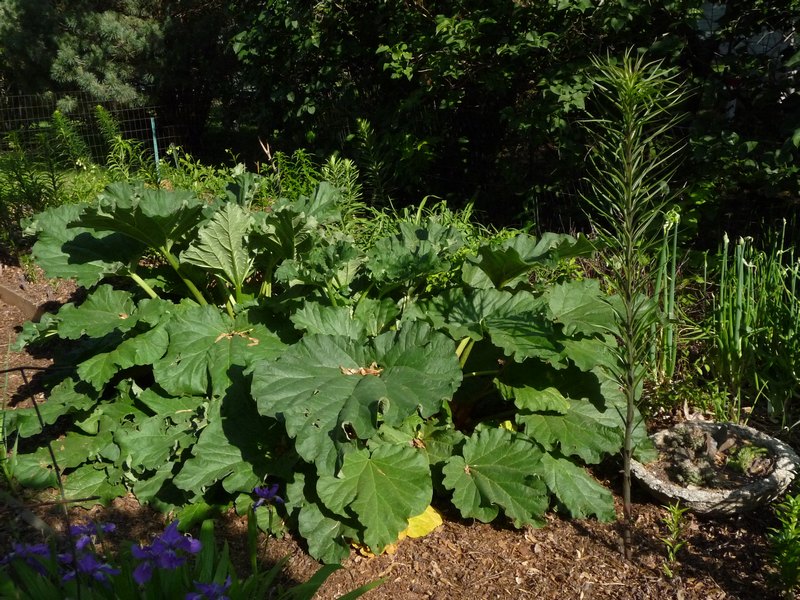 An excuse to post this pic: our drought that lasted from September through April finally broke a week or so ago. You can see how the vegetable rhubarb has responded with the more normal leaf size. However, still not quite as large as they usually are this time of year...