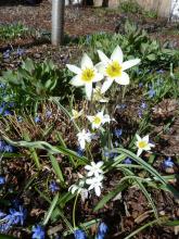 I've planted several Narcissi and tulips. Both the roe deer and the mice like tulips but Narcissi are left. Here are however a rare tulip (an unnamed species) and a lateflowering Narcissus.