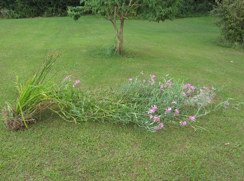 Also beware of plants given to you. I've received many delightful Hemerocallis hybrids from a friend who is a daylily hybrizer extraordinaire, but one such daylily gift sprouted with a perennial sweet pea (I don't know which one, let me know if you recognize it). I have pulled the sweet pea sprouts endlessly, but the sweet pea nearly won in the battle, here's a view of the daylily dug up, with 7'-8' of sweet pea vine hanging on. It had spread 7'-8' in all directions, a 16' monster. The Sweet Pea roots were like giant twisting ropes, I'm surprised it didn't strangle the daylily to death, the sweet pea and the many seedlings now removed.