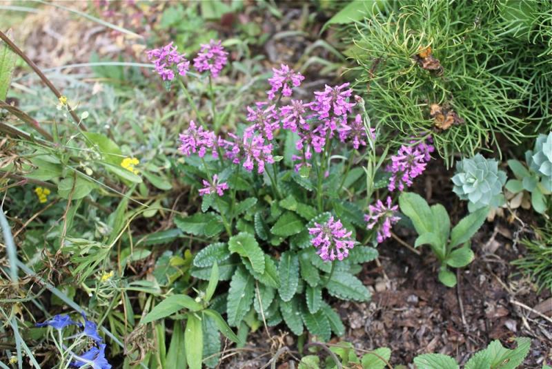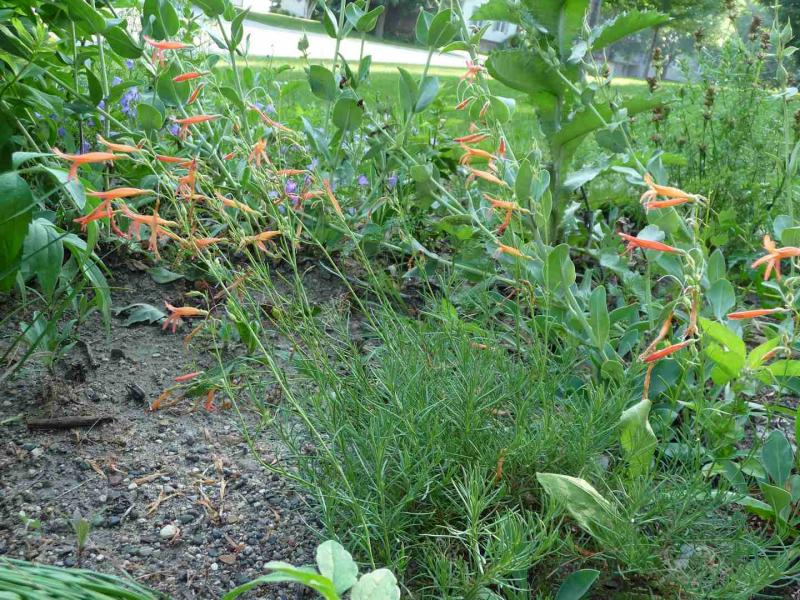 Ruellia humilis, Stachys monieri 'Hummelo' and Penstemon pinifolius. In the background you can see the Onopordum stem.
