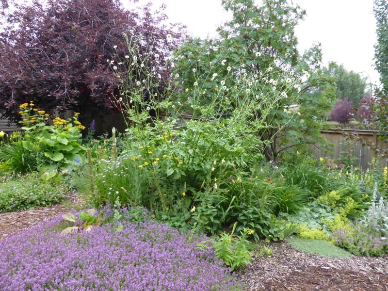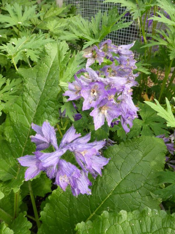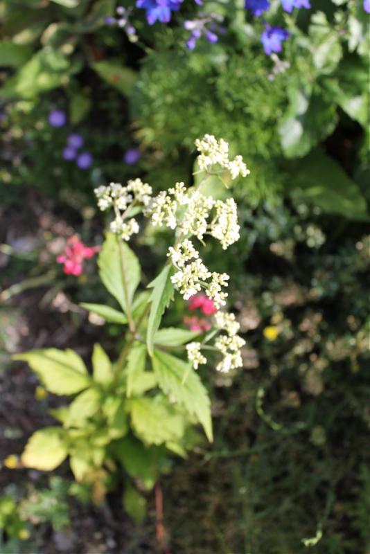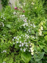 Adenophora remotiflora f. album, a rather spready and floppy thing, even amongst the competition in the border; Lallemantia canescens; Symphyandra zanzegur; the first of Delphinium grandiflorum, which will be blooming en masse soon; a white-flowered Verbascum, possibly Verbascum chaixii 'Album' but not sure what sorts of cross-pollination have gone on over the years!