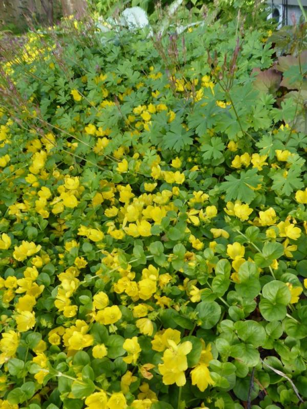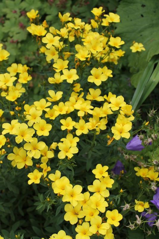 Update on Cerinthe major purpurascens, much taller than I recall from when I grew it long ago; Mimulus guttatus along the edge of the greenhouse; Linum flavum compactum: