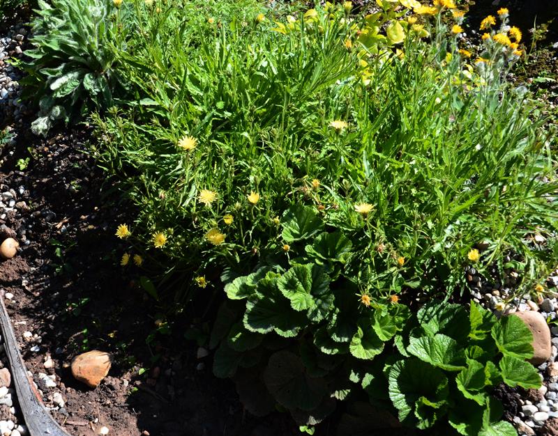 Thu, 08/15/2013 - 12:19pmI did finally get the Hieracium photos (a couple pages back) re-embedded, but more recently the Hieracium intybaceum finally opened more flowers at once- and the plants have got quite large and sprawling- probably they'd be a bit smaller in a leaner environment, but I expected them to get too big for the rock garden proper, and not enough gravel to make the berms that lean.. I don't mind them in their sprawling form, but may try some at the dry end of the property out of curiosity.. in the second shot you also see Geum coccineum, and Hieracium villosum behind putting on a nice show..Then, time to get outdoors and back to the digging!