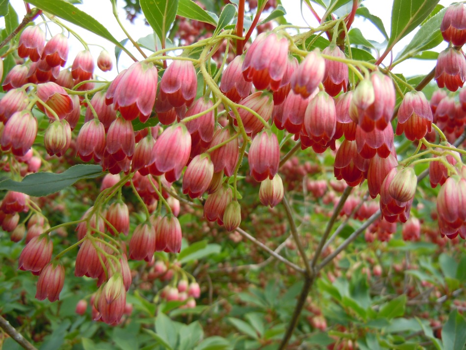 I have some peatloving shrubs, here are two different colours of Enkianthus campanulatus: palibinii and a white form. Rhodotypos scandens is an interesting shrub too.