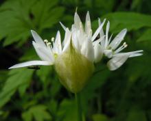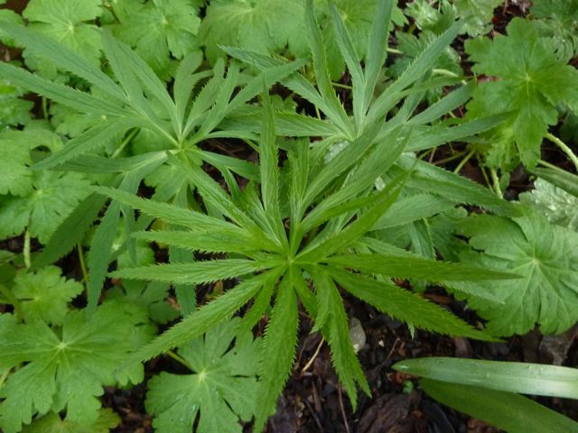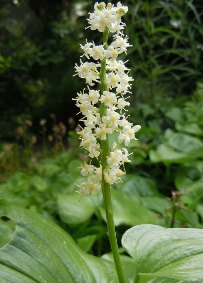 The native ramson (Allium ursinum) has started flowering in the shady woodland and the unknown Arisaema, late as usual, soon follows. Another very shade tolerant plant is Maianthemum dilatatum. Here the flowering stems always get three leaves and the nonflowering is 15-20cm long. It is much bigger than the native M bifolia. The leaves of Rodgersia aesculifolia also emerge now, among the latecomers.