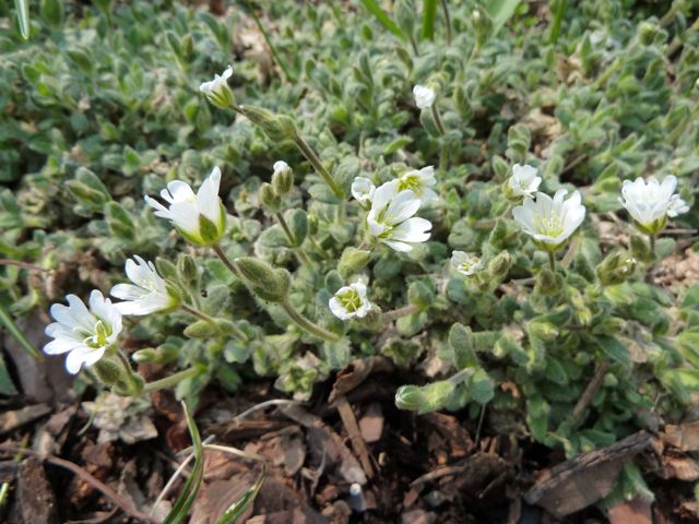 Cerastium alpinum ssp. lanatum is blooming here; would be better in lean conditions than the regular soil it's in: