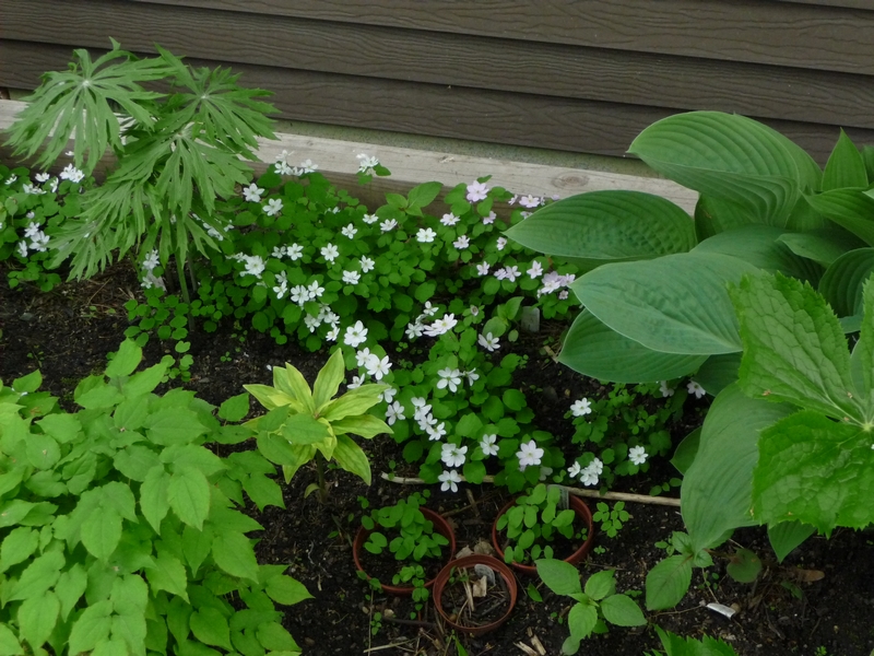 Native Thalictrum thalictroides among Syneilesis aconitifolia, epimedium, Hosta nigrescens. In the pot rings are those seedling Jeffersonia diphylla from the seed you gave me, Mark.