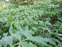 On higher and drier ground Polygonatum multiflorum makes huge patches and as groundcover under rhododendron Rodgersia podophylla makes a good job - almost too good!