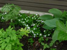 Thu, 05/26/2011 - 7:08pmEpimedium diphyllum 'Roseum' and E. x youngianum 'Niveum' are both small epimediums. Even though Pulmonaria 'Baby Blue' is a small lungwort,the foliage is five times larger than the leaflets on the epimediums, and have the silver spots that scream out: "Look at me!". The eppies, not so much. This all makes Baby Blue look like a giant among them, at least in my eyes.