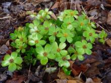Hacquetia epipactis flower bracts were touched; they are not supposed to be white, and never have been before this.
