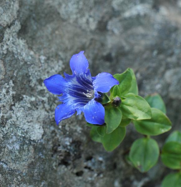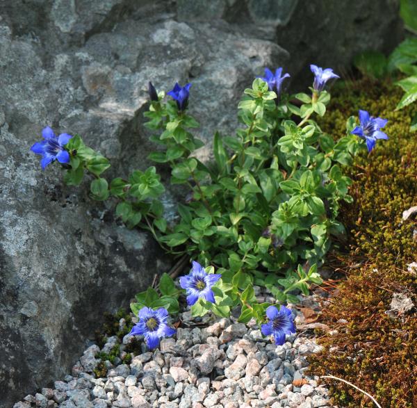This gentian is endemic to Pakistan and Kashmir where is grows among rocks at 8000-14,000 feet. Plants have many trailing stems 10-20 cm. The paired leaves are ovate. Stems terminate in a solitary, deep blue, trumpet-shaped flower that is 3.5-4.5 cm long. In the wild it blooms August to October.