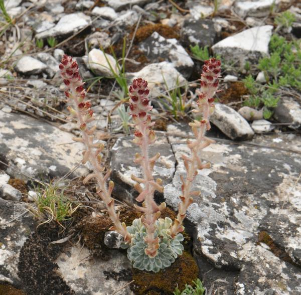 Saxifraga federici-augusti is also known in cultivation as S. grisebachii. It is commonly referred to as the Engleria saxifrage. This species is native to Greece, Albania and south-central Macedonia, where it grows on limestone screes, cracks and crevices. Plants produce attractive, evergreen, silver-grey rosettes, 5-8 cm in diameter. From February to late June, nodding flowers are produced on recurved stems 15-25 cm tall. The leaves on the flower stems are reddish-pink and covered in silvery hairs. The reddish-pink flowers are narrow with extended stamens.