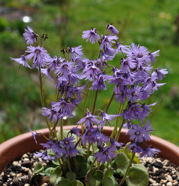 Hungarian snowbells are native from beech forests to subalpine meadows in the southern and eastern Carpathian Mountains. Plants produce a rosette of evergreen, leathery, round to kidney-shaped leaves, about 2.5 cm in diameter. In early spring, leafless stems arise 10-15 cm tall, topped with a cluster of nodding, open bell-shaped bluish-violet flowers which have distinctive heavily fringed edges.